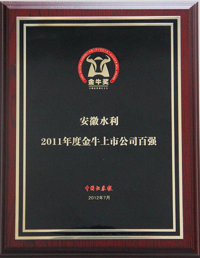 7月7日,中國(guó)證券報(bào)第14屆(2011年度)“上市公司金牛獎(jiǎng)”頒獎(jiǎng)活動(dòng)在天津隆重舉行,安徽水利榮獲“2011年度金牛上市公司百?gòu)?qiáng)”榮譽(yù)稱號(hào),并以綜合實(shí)力位列百?gòu)?qiáng)榜第58位,這是安徽水利首次獲得該項(xiàng)殊榮。