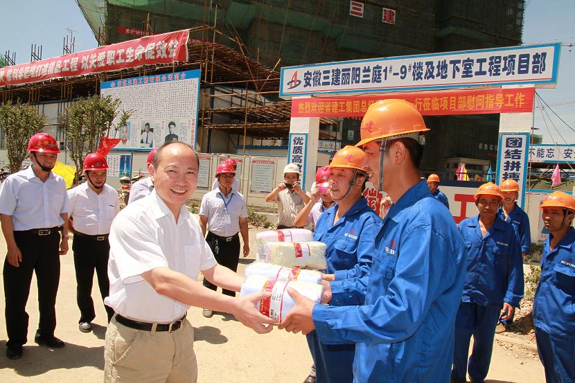 7月24日上午, 安徽建工集團(tuán)總經(jīng)理、副董事長、黨委副書記趙時運(yùn),在紀(jì)委書記、工會主席牛曙東及省三建公司黨委書記徐曉光、副總經(jīng)理左登宏等陪同下,冒著酷暑來到該公司投資開發(fā)的全椒縣麗陽蘭庭房地產(chǎn)項(xiàng)目部,親切慰問奮戰(zhàn)在一線員工,并給他們送去了綠豆、白糖、毛巾、人丹、風(fēng)油精等防暑降溫用品,察看了項(xiàng)目施工生產(chǎn)情況和樓盤營銷情況。