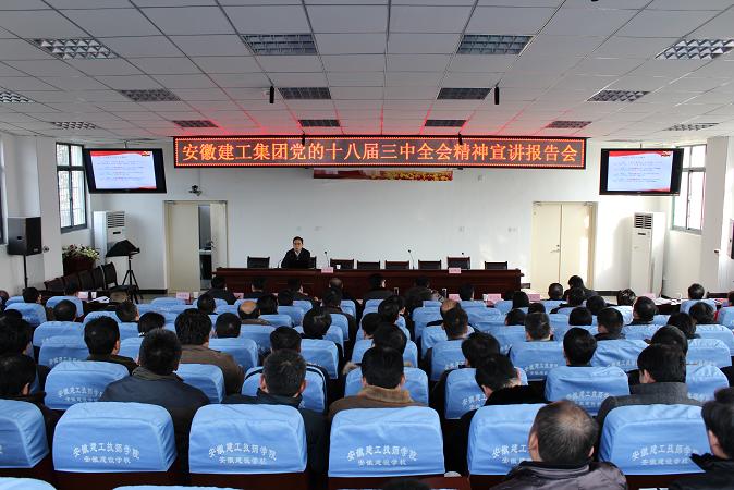 2月21日上午,省國(guó)資委黨的十八屆三中全會(huì)精神宣講團(tuán)來到安徽建工集團(tuán)作專場(chǎng)宣講。宣講團(tuán)成員、省國(guó)資委綜合法規(guī)處處長(zhǎng)王思軍同志作專題報(bào)告,省國(guó)資委組宣處副處長(zhǎng)秦正敏出席報(bào)告會(huì)。集團(tuán)公司領(lǐng)導(dǎo)全體成員、集團(tuán)機(jī)關(guān)部門負(fù)責(zé)人,所屬各單位、直屬經(jīng)濟(jì)實(shí)體領(lǐng)導(dǎo)班子成員,共 140余人聆聽了報(bào)告。