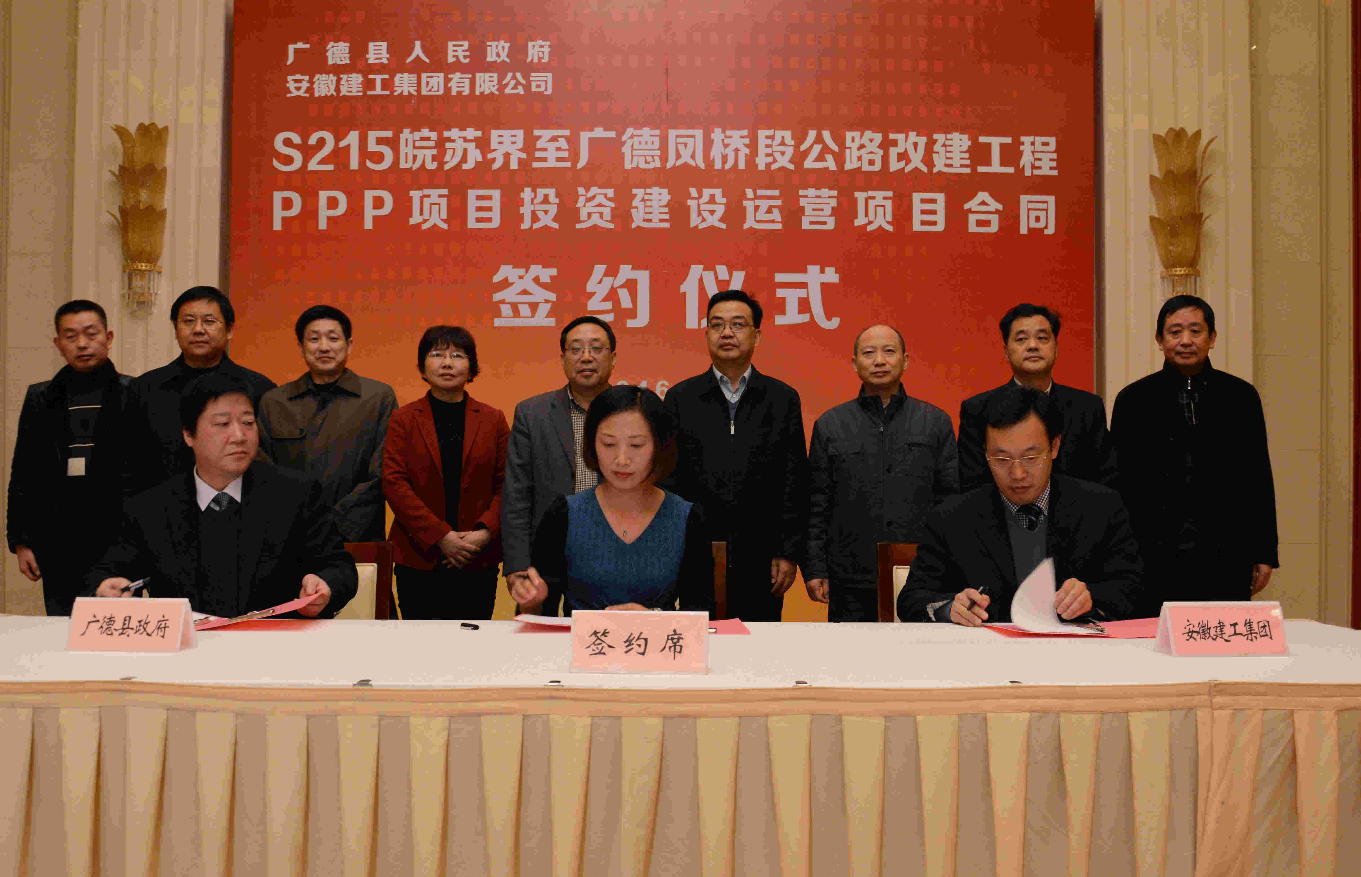 1月8日下午,安徽建工集團(tuán)有限公司和廣德縣人民政府共同簽署了S215皖蘇界至廣德鳳橋段公路改建工程PPP項(xiàng)目投資建設(shè)運(yùn)營項(xiàng)目合同,此舉標(biāo)志繼去年雙方簽署合作框架協(xié)議后,我省首個(gè)普通國省干線“政府與社會(huì)資本合作”(PPP)項(xiàng)目正式落地實(shí)施。安徽建工集團(tuán)董事長、黨委書記趙時(shí)運(yùn)參加簽約儀式。省交通運(yùn)輸廳黨組成員、副廳長徐敬啟主持儀式,省國資委黨委委員、副主任項(xiàng)小龍和省財(cái)政廳有關(guān)領(lǐng)導(dǎo)應(yīng)邀出席簽約儀式。
