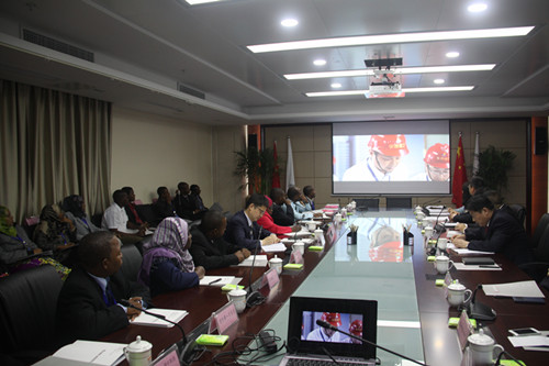 (桑給巴爾研修班一行在觀看安徽建工宣傳片)