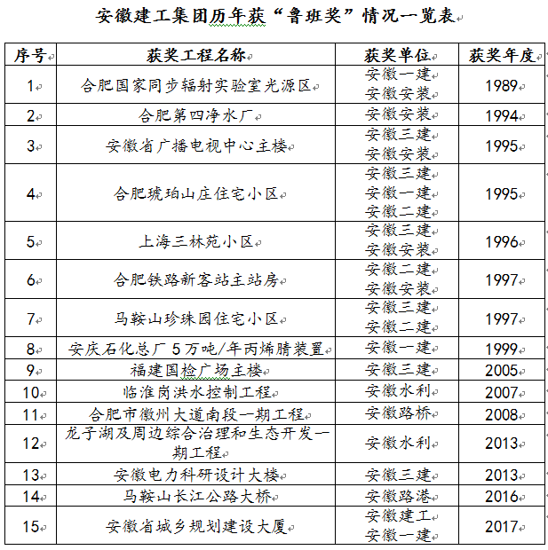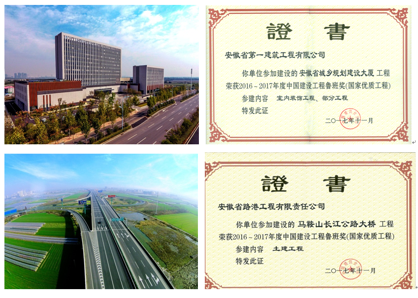 2017年11月6日,中國(guó)建筑業(yè)協(xié)會(huì)“紀(jì)念魯班獎(jiǎng)創(chuàng)立30周年暨2016-2017年度創(chuàng)精品工程經(jīng)驗(yàn)交流會(huì)”在北京隆重召開(kāi)。安徽建工集團(tuán)有限公司承建(安徽省第一建筑工程有限公司參建)的“安徽省城鄉(xiāng)規(guī)劃建設(shè)大廈”和安徽路港工程有限責(zé)任公司參建的“馬鞍山長(zhǎng)江公路大橋”兩項(xiàng)工程喜獲2016年-2017年度中國(guó)建設(shè)工程“魯班獎(jiǎng)(國(guó)家優(yōu)質(zhì)工程)”。自1987年“魯班獎(jiǎng)”創(chuàng)立以來(lái)安徽建工集團(tuán)有限公司共獲15項(xiàng)“魯班獎(jiǎng)(國(guó)家優(yōu)質(zhì)工程)”,經(jīng)申報(bào)評(píng)選在此次表彰會(huì)上被授予“創(chuàng)建魯班獎(jiǎng)工程優(yōu)秀企業(yè)(承建單位)”榮譽(yù)稱號(hào), 充分體現(xiàn)了國(guó)有大型特級(jí)施工總承包企業(yè)的榜樣引領(lǐng)和示范帶頭作用,最好地詮釋了“誠(chéng)信、創(chuàng)新、優(yōu)質(zhì)、共贏”的安徽建工經(jīng)營(yíng)理念。
