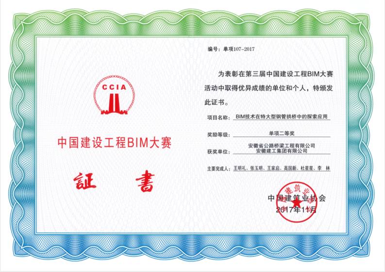日前,由中國建筑協會主辦的“建設工程BIM技術成果推廣應用經驗交流會”在廈門召開。會上對第三屆中國建設工程BIM大賽獲獎單位和個人頒發(fā)榮譽證書。集團公司組織安徽路橋完成的“BIM技術在特大型鋼管拱橋中的探索應用”獲得二等獎,組織安徽三建完成的“中國科學技術大學物質科學教研樓項目BIM技術應用”獲得三等獎。