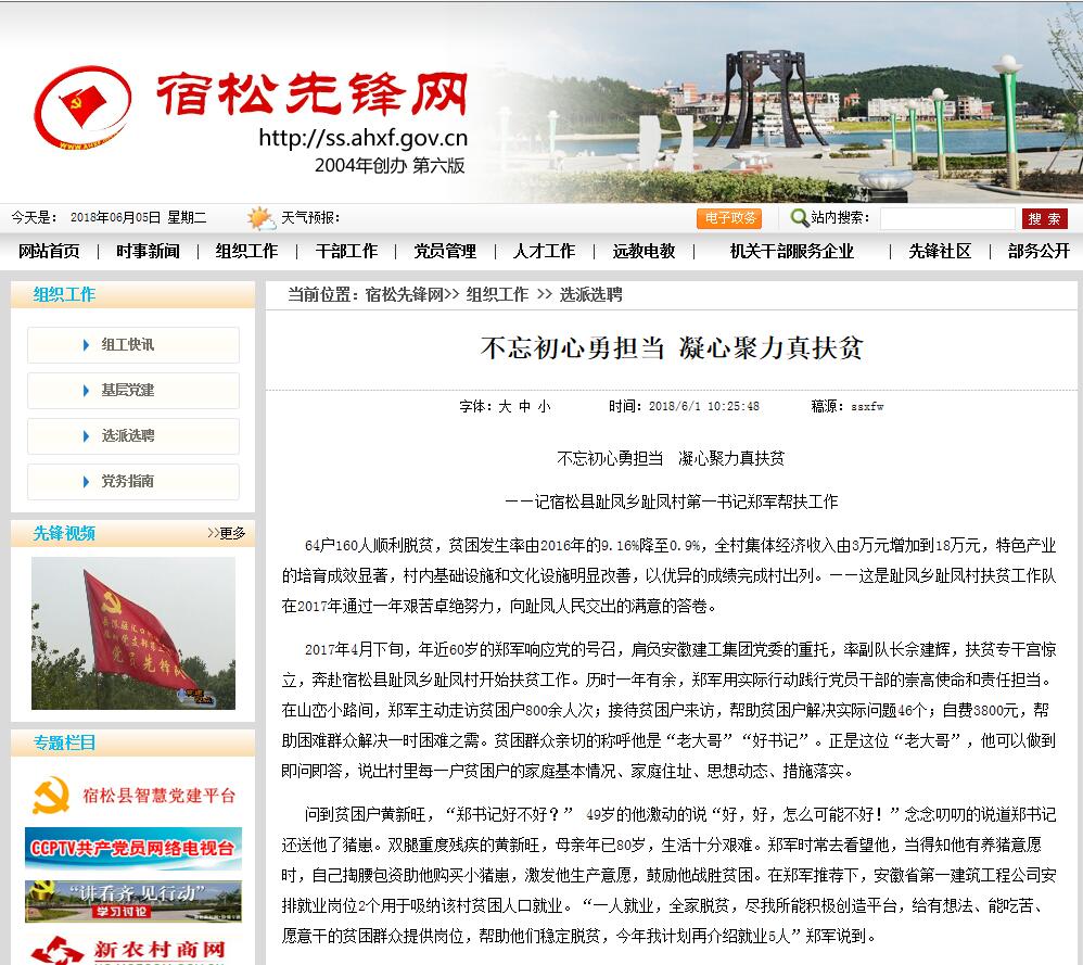 報(bào)道指出,2017年4月下旬,年近60歲的鄭軍響應(yīng)黨的號(hào)召,肩負(fù)安徽建工集團(tuán)黨委的重托,率副隊(duì)長(zhǎng)佘建輝,扶貧專干宮驚立,奔赴宿松縣趾鳳鄉(xiāng)趾鳳村開展扶貧工作。如今,歷時(shí)一年有余,鄭軍用實(shí)際行動(dòng)很好的踐行了黨員干部的崇高使命和責(zé)任擔(dān)當(dāng)。實(shí)現(xiàn)了64戶160人順利脫貧,貧困發(fā)生率由2016年的9.16%降至0.9%,全村集體經(jīng)濟(jì)收入由3萬元增加到18萬元,并以優(yōu)異的成績(jī)完成村出列。