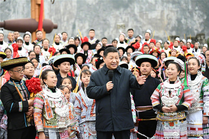 春節(jié)前夕,習(xí)近平總書記赴貴州考察調(diào)研并看望慰問基層干部群眾。3日下午,他來到畢節(jié)市黔西縣,實(shí)地察看烏江六沖河段生態(tài)環(huán)境,走進(jìn)新仁苗族鄉(xiāng)化屋村看望鄉(xiāng)親們。在村文化廣場,習(xí)近平同參加少數(shù)民族春節(jié)民俗活動的群眾親切交流,并向全國各族人民致以新春祝福。