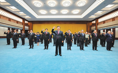 參觀結(jié)束后,習(xí)近平等黨員領(lǐng)導(dǎo)同志來到黨史展覽館紅色大廳。面向鮮紅的中國共產(chǎn)黨黨旗,習(xí)近平舉起右拳,帶領(lǐng)領(lǐng)導(dǎo)同志重溫入黨誓詞,鏗鏘有力的宣誓聲響徹大廳。