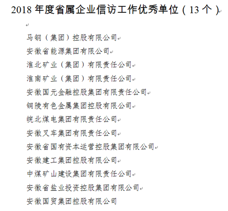 4月26日,安徽建工集團(tuán)控股有限公司被安徽省人民政府國有資產(chǎn)監(jiān)督管理委員會(huì)授予“2018年度省屬企業(yè)信訪工作責(zé)任目標(biāo)考核優(yōu)秀單位”榮譽(yù)稱號(hào)。