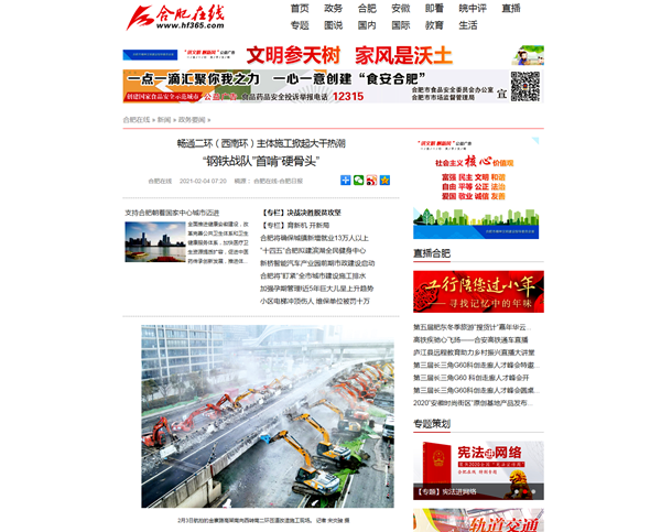 人民網(wǎng)【新春走基層】專欄報(bào)道了該項(xiàng)目大年三十工地不打烊,參建人員持續(xù)奮戰(zhàn)在施工一線。中國(guó)日?qǐng)?bào)海外版《End of the road》、合肥日?qǐng)?bào)《“鋼鐵戰(zhàn)隊(duì)”首啃“硬骨頭”》報(bào)道了公司第二次對(duì)老舊匝道橋拆除工作的場(chǎng)景。安徽衛(wèi)視超級(jí)新聞場(chǎng)等媒體以《“鋼鐵戰(zhàn)士”組隊(duì) 南二環(huán)改造工程第二階段施工啟動(dòng)》報(bào)道了南二環(huán)改造工程順利進(jìn)入第二階段施工節(jié)點(diǎn)的訊息。學(xué)習(xí)強(qiáng)國(guó)合肥學(xué)習(xí)平臺(tái)、澎湃新聞以《合肥:暢通南二環(huán) 鉚足干勁 大干正酣》為題,合肥新聞聯(lián)播以《“步履不停”保暢通 建設(shè)按下“快進(jìn)鍵”》《過年堅(jiān)守南二環(huán) 來(lái)年道路早暢通》為題,報(bào)道了春節(jié)期間該項(xiàng)目施工現(xiàn)場(chǎng)干出的“加速度”。抖音等自媒體平臺(tái)以短視頻形式展示了數(shù)十臺(tái)機(jī)械同時(shí)作業(yè)的震撼場(chǎng)面,關(guān)注熱度超過3百萬(wàn),安徽路橋速度得到合肥市民的再次點(diǎn)贊。