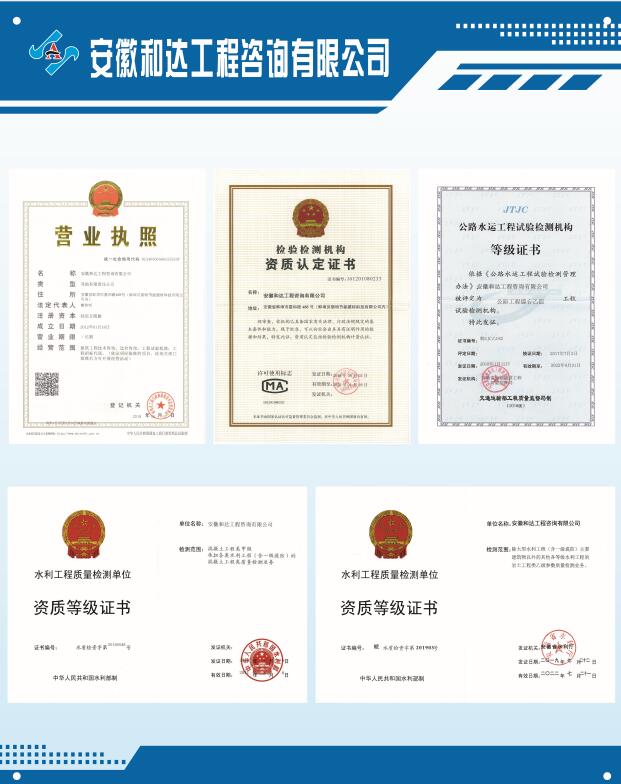 和達(dá)咨詢的前身是安徽水利中心實(shí)驗(yàn)室,2012年因交通項(xiàng)目市場(chǎng)經(jīng)營(yíng)及質(zhì)量監(jiān)管需要,注冊(cè)成立安徽江河試驗(yàn)檢測(cè)有限公司,2018年更名為安徽和達(dá)工程咨詢有限公司。經(jīng)過多年發(fā)展,現(xiàn)擁有“交通部公路工程試驗(yàn)檢測(cè)綜合乙級(jí)”“水利部水利混凝土專項(xiàng)甲級(jí)”及“巖土專項(xiàng)乙級(jí)”檢測(cè)資質(zhì),取得安徽省質(zhì)量技術(shù)監(jiān)督局計(jì)量認(rèn)證(CMA)證書,具有“建設(shè)廳建設(shè)工程造價(jià)咨詢乙級(jí)”資質(zhì)。檢測(cè)用房面積1800平方米,設(shè)有收樣室、留樣室、人防檢測(cè)室、人防檢測(cè)平臺(tái)等20余個(gè)專業(yè)功能室和400余臺(tái)套檢測(cè)設(shè)備,基本滿足日常試驗(yàn)檢測(cè)需要。實(shí)現(xiàn)營(yíng)業(yè)收入、利潤(rùn)、上繳資金逐年大幅增長(zhǎng),2019年代表蚌埠市成功申報(bào)建設(shè)國(guó)家級(jí)檢驗(yàn)檢測(cè)集聚區(qū)(安徽),被蚌埠市列為重點(diǎn)發(fā)展檢測(cè)機(jī)構(gòu)。