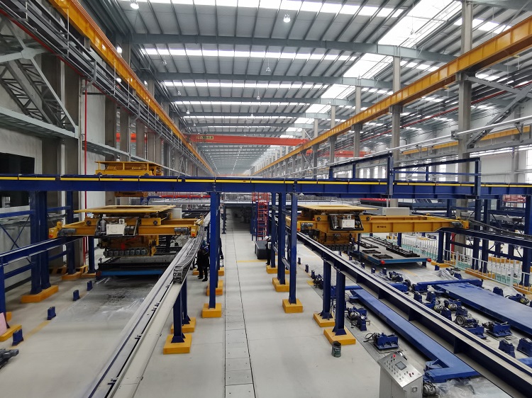 北城工業(yè)公司從整體到布局完成了生產(chǎn)工藝大改革。將傳統(tǒng)單一生產(chǎn)線采改為綜合構(gòu)件生產(chǎn)流水線,保證一線多類構(gòu)件同時(shí)生產(chǎn),實(shí)現(xiàn)了異形構(gòu)件同點(diǎn)混凝土澆筑工藝;混凝土飛船從單線轉(zhuǎn)為雙線運(yùn)輸,實(shí)現(xiàn)多線混凝土同時(shí)澆筑;養(yǎng)護(hù)窯更改為高倉(cāng)位下沉式養(yǎng)護(hù)窯,充分利用地下空間,提高倉(cāng)位空間使用率,單線實(shí)現(xiàn)同時(shí)養(yǎng)護(hù)57座模臺(tái),并可實(shí)現(xiàn)異型構(gòu)件進(jìn)窯護(hù)養(yǎng)護(hù);考慮到廠區(qū)占地面積減少,為提高空間利用率,設(shè)計(jì)采用了大面積連通式鋼平臺(tái),并配有帶軌道運(yùn)輸車,大大提高了材料存放、運(yùn)輸效率;桁架筋自動(dòng)生產(chǎn)設(shè)備、網(wǎng)片自動(dòng)焊接生產(chǎn)設(shè)備、管片鋼筋自動(dòng)切割分揀彎弧設(shè)備,實(shí)現(xiàn)了鋼筋智能化加工?;炷翑嚢铏C(jī)從立軸攪拌改為雙臥軸攪拌,實(shí)現(xiàn)混凝土強(qiáng)制拌合;蒸汽養(yǎng)護(hù)從市政公用改為自有式多聯(lián)機(jī)組蒸汽發(fā)生器,靈活使用,節(jié)約成本;貨場(chǎng)桁吊由單梁改為雙梁懸臂吊,擴(kuò)大吊運(yùn)范圍,實(shí)現(xiàn)構(gòu)件無(wú)障礙倒運(yùn)。攪拌站擁有全封閉的上料系統(tǒng),有9個(gè)骨料倉(cāng)和2個(gè)輸送線組成,大噸位多組料倉(cāng)可大量?jī)?chǔ)存原材料,全封閉自動(dòng)上料系統(tǒng),無(wú)粉塵,實(shí)現(xiàn)綠色環(huán)保。