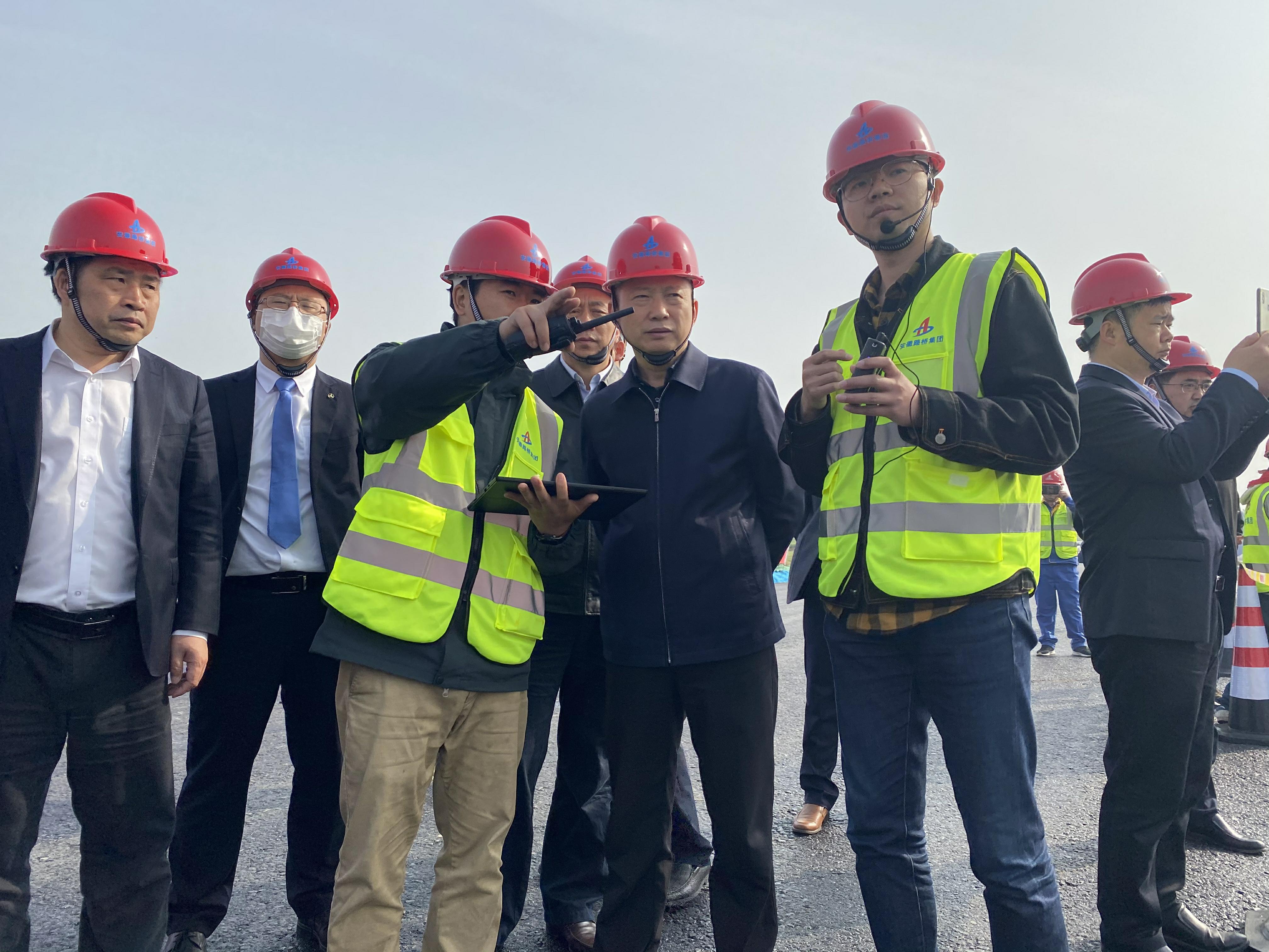 在G347安九二期PPP項(xiàng)目路面施工現(xiàn)場(chǎng),趙時(shí)運(yùn)饒有興致地觀摩智能無人駕駛瀝青攤鋪試驗(yàn)段施工,并與技術(shù)人員就車輛定位、無線通信、自動(dòng)控制和可視化技術(shù)進(jìn)行深入交流。在楊灣河特大橋施工現(xiàn)場(chǎng),趙時(shí)運(yùn)詳細(xì)了解了項(xiàng)目部依托“BIM+物聯(lián)網(wǎng)”技術(shù)的智慧工地建設(shè)情況,觀看了物料集成系統(tǒng)演示。