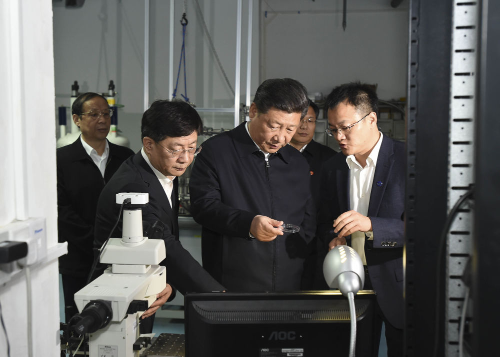 ??2016年4月26日,習(xí)近平在中國科技大學(xué)近代物理系自旋磁共振實(shí)驗(yàn)室了解科研情況。
