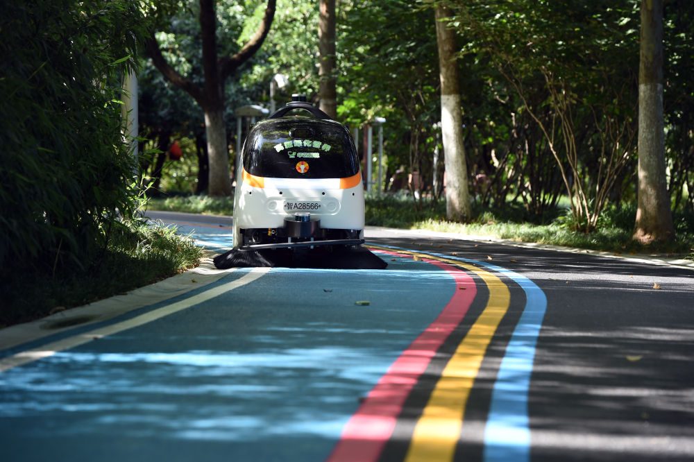 ??2022年6月24日,智能無人清掃機(jī)器人在安徽合肥一處公園清掃路面。