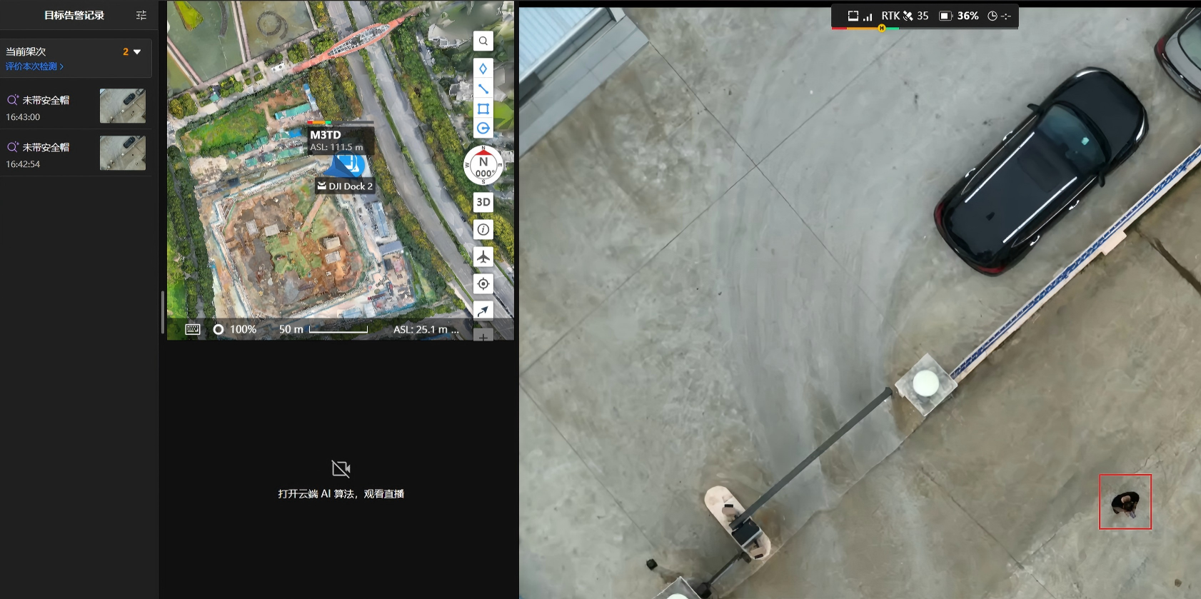 該項(xiàng)目部署具備定時自主飛行與實(shí)時傳輸能力的無人機(jī)機(jī)場系統(tǒng),結(jié)合AI算法引擎實(shí)現(xiàn)施工現(xiàn)場精度還原與目標(biāo)智能感知。在安全管理方面,無人機(jī)按預(yù)設(shè)航線自動巡檢或遠(yuǎn)程操控,實(shí)時回傳畫面,AI大模型視覺算法可自動識別未帶安全帽、臨邊區(qū)域等隱患,觸發(fā)告警并記錄目標(biāo)信息,助力管理人員快速排查處置,擴(kuò)大巡查范圍、縮短隱患處置時間,提升安全管理效率。