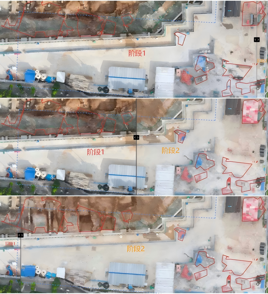 通過空間模型與時間軸結(jié)合,系統(tǒng)對多時間點(diǎn)二維、三維及斷面模型數(shù)據(jù)自動比對,直觀呈現(xiàn)土方開挖變化與工程進(jìn)度,為進(jìn)度計劃制定和優(yōu)化提供支撐。同時,AI圖像比對技術(shù)可自動識別不同時間點(diǎn)模型間的差異區(qū)域,實(shí)現(xiàn)施工區(qū)域動態(tài)變化精準(zhǔn)監(jiān)控。