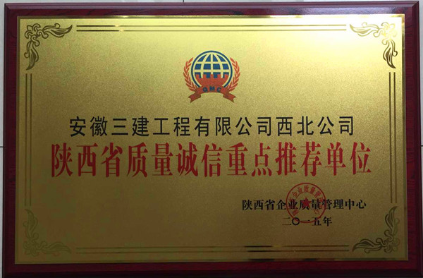 近日,安徽三建西北公司被陜西省企業(yè)質(zhì)量管理中心評(píng)為“陜西省工程質(zhì)量AAAAA級(jí)信譽(yù)單位”、“陜西省質(zhì)量誠(chéng)信重點(diǎn)推薦單位”。