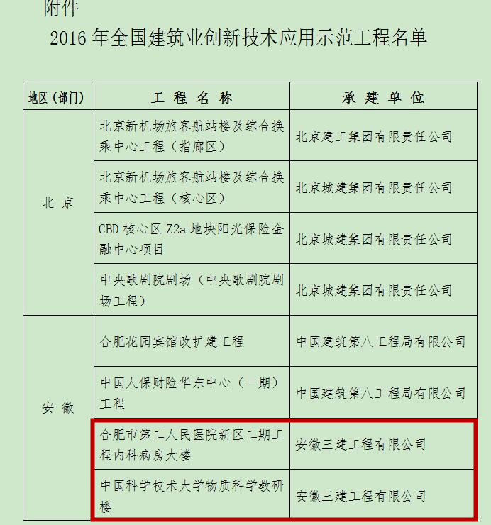 日前,從中國(guó)建筑業(yè)協(xié)會(huì)傳來(lái)喜訊,分別由安徽三建所屬四公司、八公司承建的中國(guó)科學(xué)技術(shù)大學(xué)物質(zhì)科學(xué)教研樓工程和合肥市第二人民醫(yī)院新區(qū)二期工程內(nèi)科病房大樓工程雙雙成功獲評(píng)“2016年全國(guó)建筑業(yè)創(chuàng)新技術(shù)應(yīng)用示范工程。”