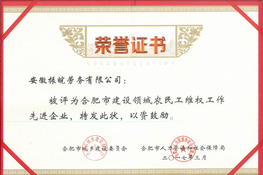 日前,合肥市城鄉(xiāng)建設(shè)委員會與合肥市人力資源和社會保障局聯(lián)合發(fā)文,表彰2016年度建設(shè)領(lǐng)域農(nóng)民工維權(quán)工作突出貢獻單位,安徽三建公司所屬安徽振皖勞務(wù)有限公司榮獲合肥市2016年度“建設(shè)領(lǐng)域農(nóng)民工維權(quán)工作先進企業(yè)”稱號。