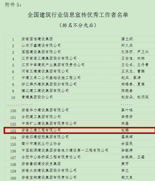 據(jù)悉,該獎(jiǎng)項(xiàng)是經(jīng)各市建筑業(yè)協(xié)會(huì)推薦,中國(guó)建筑業(yè)專家評(píng)審會(huì)審定,后期將召開表彰會(huì)議。此獎(jiǎng)項(xiàng)的獲得,標(biāo)志著安徽三建公司在一年一度的全國(guó)建筑行業(yè)信息傳媒工作競(jìng)賽中奮力趕超,勇創(chuàng)佳績(jī),再攀高峰?!栋不杖▓?bào)》多年獲此榮譽(yù),公司網(wǎng)站首次獲此殊榮。