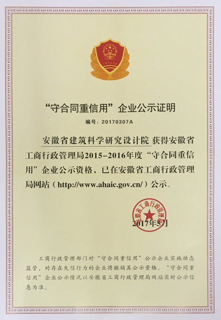 近日,經(jīng)安徽省工商行政管理局評(píng)定公示,安徽省建科院、省質(zhì)檢二站榮獲2015-2016年度省級(jí)“守合同重信用”企業(yè)榮譽(yù)稱號(hào)。