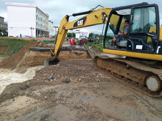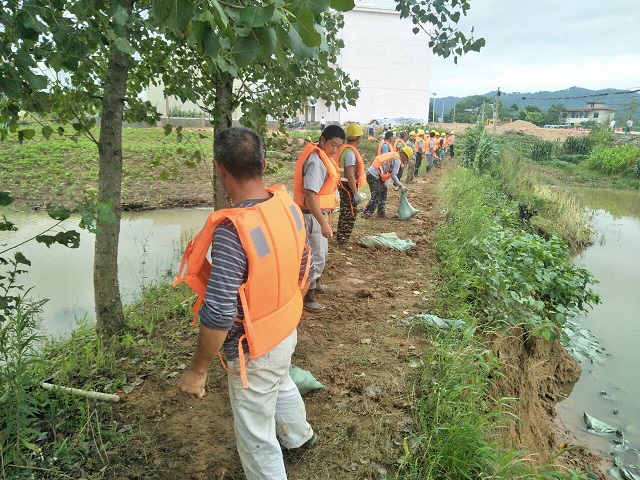 在2日凌晨1點接到當(dāng)?shù)卣目购閾岆U通知后,安徽路港G347普樅段LJ-06標(biāo)項目部立即啟動防汛應(yīng)急預(yù)案,迅速組織人員就位,開始抗洪搶險工作。項目部領(lǐng)導(dǎo)班子和全體黨員、團員青年組成了抗洪搶險突擊隊,帶著機械設(shè)備沿線排水泄洪,保障水系暢通,及時緩解道路積水。裝泥沙、運沙袋、碼沙袋,大家眾志成城、萬眾一心、同心同德、沉著應(yīng)對,與洪水進行了一場嚴(yán)酷的較量。