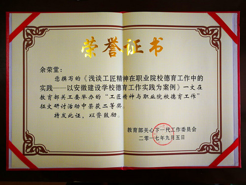 日前,從教育部網(wǎng)站傳來喜訊,教育部關(guān)心下一代工作委員會(huì)舉辦的“工匠精神與職業(yè)院校德育工作”征文研討活動(dòng)評(píng)審結(jié)果揭曉,安徽省三所職業(yè)院校教師榜上有名。安徽建工技師學(xué)院(安徽建設(shè)學(xué)校)余榮堂老師撰寫的《淺談工匠精神在職業(yè)院校德育工作中的實(shí)踐——以安徽建設(shè)學(xué)校德育工作實(shí)踐為案例》一文榮獲二等獎(jiǎng)。