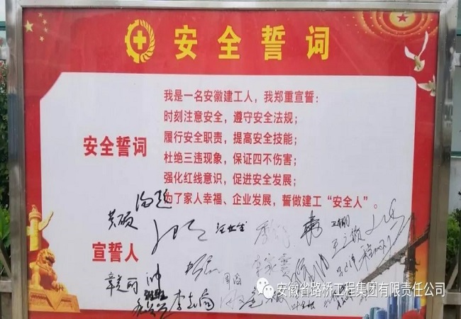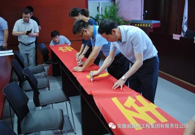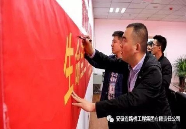 全體參會(huì)人員在印有本次安全生產(chǎn)月主題“生命至上、安全發(fā)展”的條幅上進(jìn)行簽字