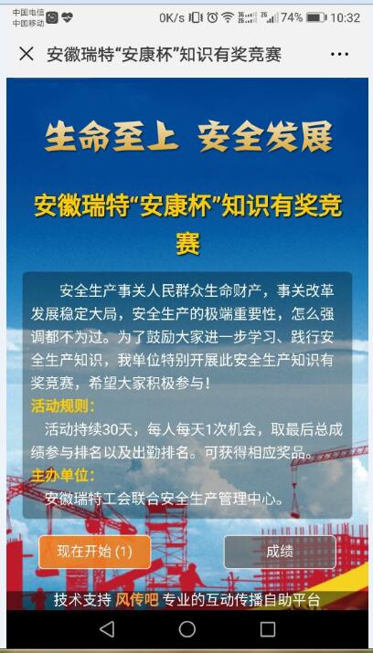 截止到6月18日,安徽瑞特工會(huì)聯(lián)合安全生產(chǎn)管理中心組織開(kāi)展了為期一個(gè)月的“安康杯”安全知識(shí)微信線上答題活動(dòng)。此次微信答題以及知識(shí)競(jìng)賽活動(dòng)內(nèi)容涵蓋安全生產(chǎn)有關(guān)法律法規(guī)、應(yīng)急救援、職業(yè)安全健康管理、工傷預(yù)防等多個(gè)方面,在工會(huì)的大力宣傳下,廣大職工積極參與。