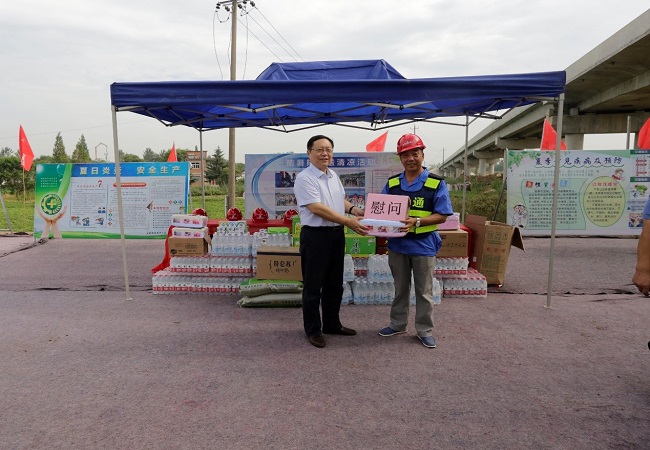 錢總一行來到項(xiàng)部施工現(xiàn)場看望和慰問奮戰(zhàn)在施工一線干部職工,為廣大職工送去藥品、飲料等防暑降溫物品。錢總對(duì)安徽路橋集團(tuán)廣大職工戰(zhàn)高溫、斗酷暑,堅(jiān)持在一線施工的艱苦奮斗精神給予高度贊揚(yáng),對(duì)項(xiàng)目部現(xiàn)階段工作給予了肯定,要求項(xiàng)目部要進(jìn)一步加強(qiáng)管理,做好夏季施工防暑降溫工作,優(yōu)質(zhì)高效推進(jìn)工程建設(shè)。