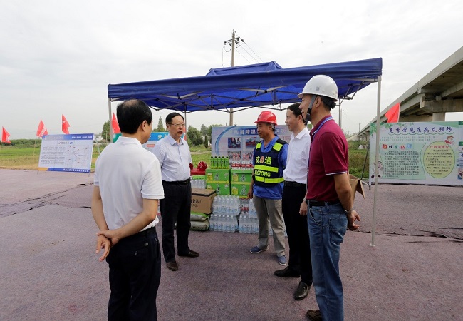 7月26日上午,省交控集團(tuán)黨委副書記、總經(jīng)理錢東升在公司黨委書記、董事長、總經(jīng)理盛明宏、交控集團(tuán)建設(shè)管理部部長蘇新國的陪同下,前往蕪合改擴(kuò)建03標(biāo)“送清涼”。公司總經(jīng)理助理、工程管理部經(jīng)理盧軍球以及項(xiàng)目辦、蕪合改擴(kuò)建03標(biāo)相關(guān)負(fù)責(zé)同志參加慰問活動(dòng)。