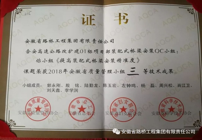 由公司選送的《提高裝配式橋梁安裝精準度》 QC小組課題榮獲2018年安徽省質量管理小組三等技術成果。裝配式橋梁尚屬于公路橋梁施工研究階段,此次QC小組活動成功解決墩柱安裝存在的主要問題,為后續(xù)裝配式橋梁施工提供了良好的施工經(jīng)驗,贏得了業(yè)主和監(jiān)理單位的好評,提升了企業(yè)形象,取得了良好的社會效益。