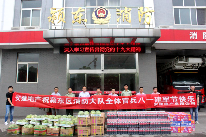 在第91個“八一建軍節(jié)”到來之際,7月27日上午,安建地產(chǎn)阜陽公司前往潁東區(qū)消防大隊,慰問戰(zhàn)斗在一線的“逆行英雄”——消防戰(zhàn)士,并送去礦泉水、西瓜、飲料等消暑物品,向他們致以誠摯的問候和節(jié)日的祝福。