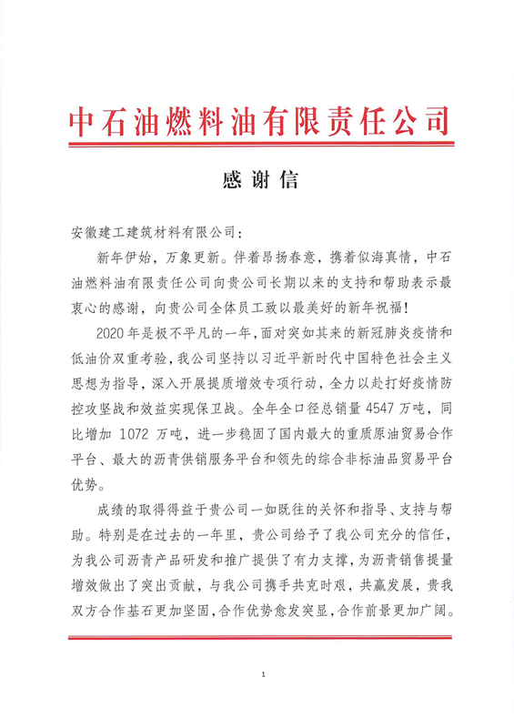 1月26日,中石油燃料油有限責(zé)任公司華東銷售分公司一行到訪安建建材,送來中石油燃料油公司北京總部寫給安建建材的感謝信。感謝信中說道:雙方合作以來,特別是在過去的一年里,安建建材為中石油燃料油公司瀝青產(chǎn)品研發(fā)和推廣提供了有力支撐,為中石油燃料油公司瀝青銷售提量增效做出了突出貢獻(xiàn),與中石油燃料油公司攜手共克時(shí)艱,共贏發(fā)展,雙方合作基石更加堅(jiān)固,合作優(yōu)勢(shì)愈發(fā)突顯,合作前景更加廣闊。