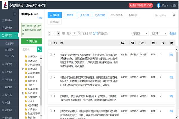 通過使用線上平臺,建立包含特種設(shè)備、環(huán)境保護(hù)、駐地建設(shè)、節(jié)后復(fù)工、疫情防控、崗前考試、全員安全教育等11類、5715道試題的題庫,安全教育不再受時間和距離制約,近年來安全教育頻率大幅度提升。