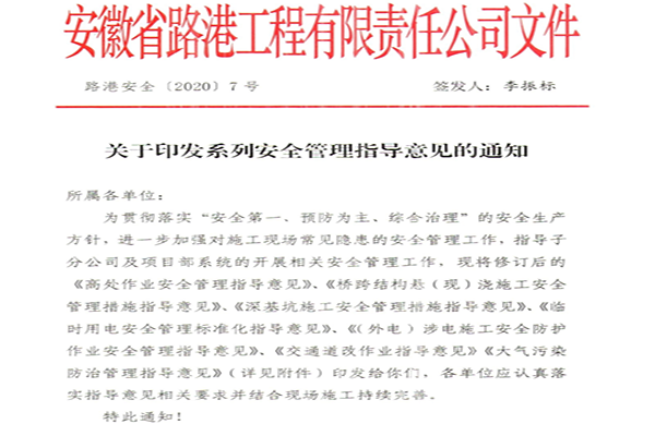 “十三五”期間,公司進(jìn)一步細(xì)化安全管理要求,印發(fā)《設(shè)備操作規(guī)程》《安全設(shè)施標(biāo)準(zhǔn)化圖集》,編制下發(fā)了高處作業(yè)、橋跨結(jié)構(gòu)懸(現(xiàn))澆施工、深基坑施工、臨時用電安全管理標(biāo)準(zhǔn)化、(外電)涉電施工安全防護(hù)、施工現(xiàn)場車輛交通、大氣污染防治管理、安全應(yīng)急管理等系列指導(dǎo)意見,指導(dǎo)施工現(xiàn)場開展安全管理工作,目前均得到有效落實(shí)。
