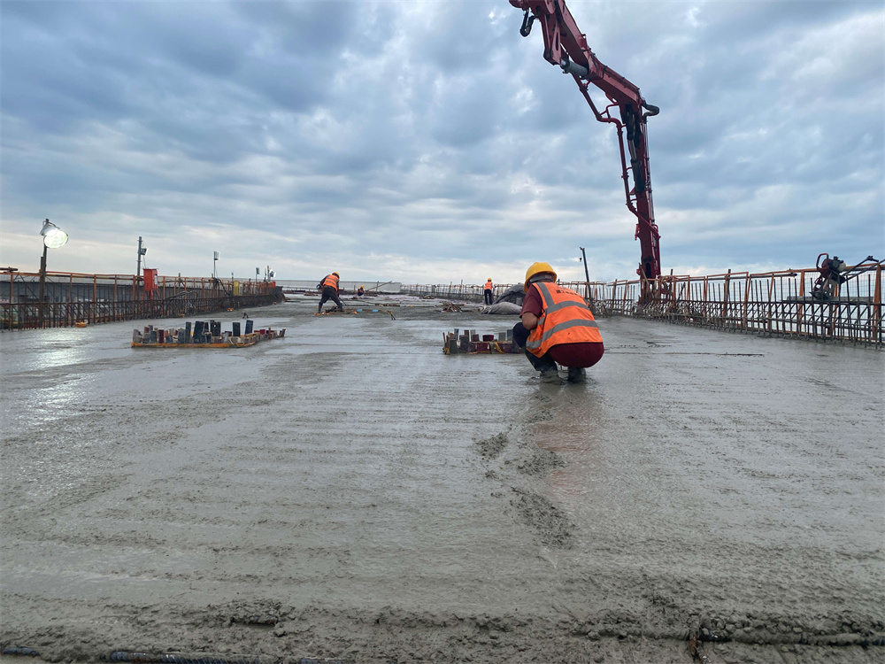 驕陽(yáng)似火,在五蒙高速05標(biāo)項(xiàng)目包集樞紐Ck0+866匝道橋第五聯(lián)現(xiàn)澆箱梁頂板砼澆筑現(xiàn)場(chǎng),工人或俯身勞作,或仰頭檢查,或并肩協(xié)作,構(gòu)成了一幅壯麗的勞動(dòng)畫(huà)卷。