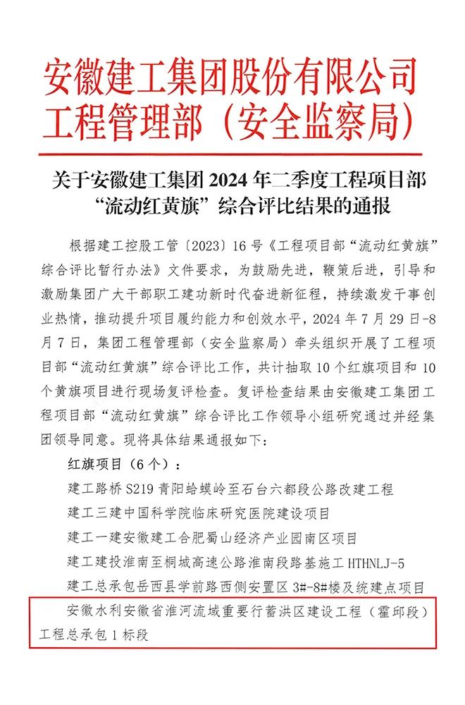 近日,由安徽水利承建的安徽省淮河流域重要行蓄洪區(qū)建設(shè)工程(霍邱段)項目在集團(tuán)“流動紅黃旗”綜合評比中成績優(yōu)異,獲評集團(tuán)二季度“流動紅旗項目部”稱號。