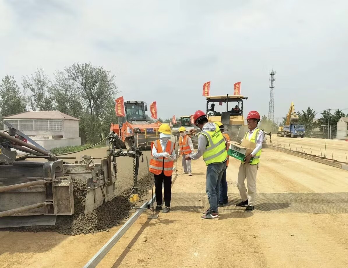 堅(jiān)守崗位不服“暑”。施工現(xiàn)場(chǎng)七、八輛壓路機(jī)來(lái)回穿梭,兩臺(tái)大型攤鋪機(jī)正在進(jìn)行攤鋪?zhàn)鳂I(yè),技術(shù)人員及時(shí)對(duì)攤鋪路段的壓實(shí)度和平整度等各項(xiàng)指標(biāo)進(jìn)行跟蹤檢測(cè),嚴(yán)格控制各個(gè)施工工序,確保攤鋪工作順利進(jìn)行。施工人員一絲不茍地進(jìn)行立模和掛線高測(cè)量復(fù)核工作,雖然汗水濕透了衣衫,但他們?nèi)匀褙炞?,毫不懈怠。截至目前,已完成全線水穩(wěn)底基層攤鋪的14.15%,為9月進(jìn)入水穩(wěn)大干階段奠定了基礎(chǔ)。
