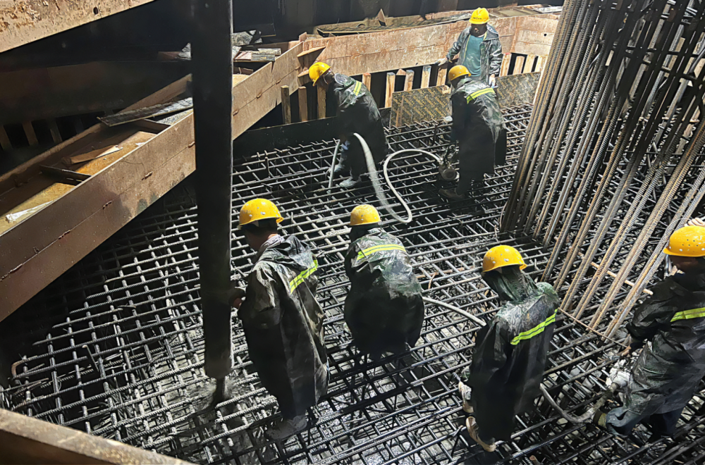 持續(xù)的陰雨天氣導(dǎo)致渦河圍堰底部潮濕寒冷、河水水位上漲、施工難度增大,項(xiàng)目一線人員輪班堅(jiān)守、攻堅(jiān)克難,確保澆筑順利進(jìn)行。