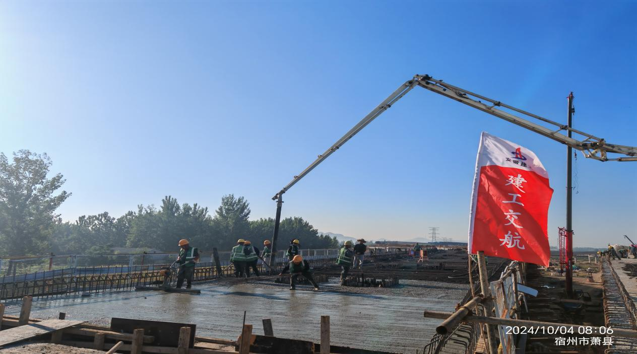 近日,經(jīng)過(guò) 10小時(shí)的連續(xù)奮戰(zhàn),徐淮阜高速宿州段路基02標(biāo)項(xiàng)目孫圩子互通C匝道橋最后一聯(lián)現(xiàn)澆頂板澆筑完成。這標(biāo)志著孫圩子互通區(qū)所有現(xiàn)澆梁全部圓滿澆筑完成,項(xiàng)目全面進(jìn)入快速收尾階段,為實(shí)現(xiàn)早日通車(chē)目標(biāo)打下了堅(jiān)實(shí)基礎(chǔ)。