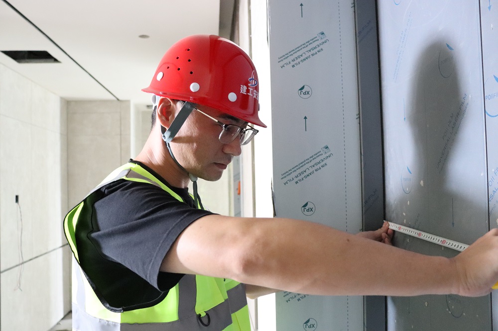 肥西縣鄉(xiāng)村文化旅游配套提升項目,技術(shù)負責(zé)人,湯楊,正在核查廳門安裝精度。丈量每一寸,精準每一毫,奮楫篤行,臻于至善,一路走來淌下的汗水,是對工作的熱愛與堅守。我在項目堅守,我為祖國慶生。