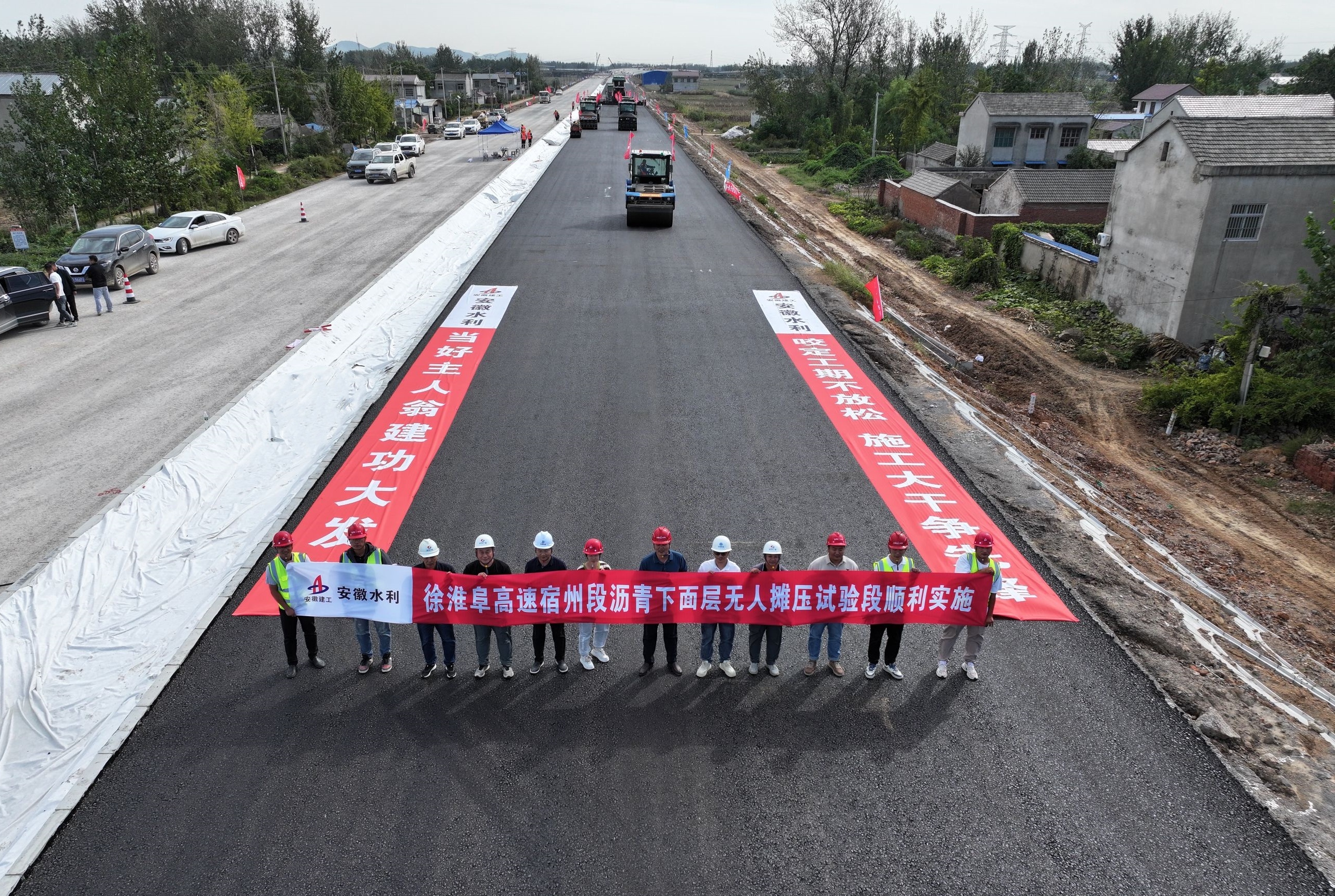 ▲10月1日,舉國同慶之際,安徽水利徐淮阜高速公路宿州段路面02標(biāo)項(xiàng)目首次應(yīng)用無人攤壓技術(shù),順利完成瀝青試驗(yàn)段攤鋪?zhàn)鳂I(yè),以實(shí)際行動向新中國75周年華誕獻(xiàn)禮。