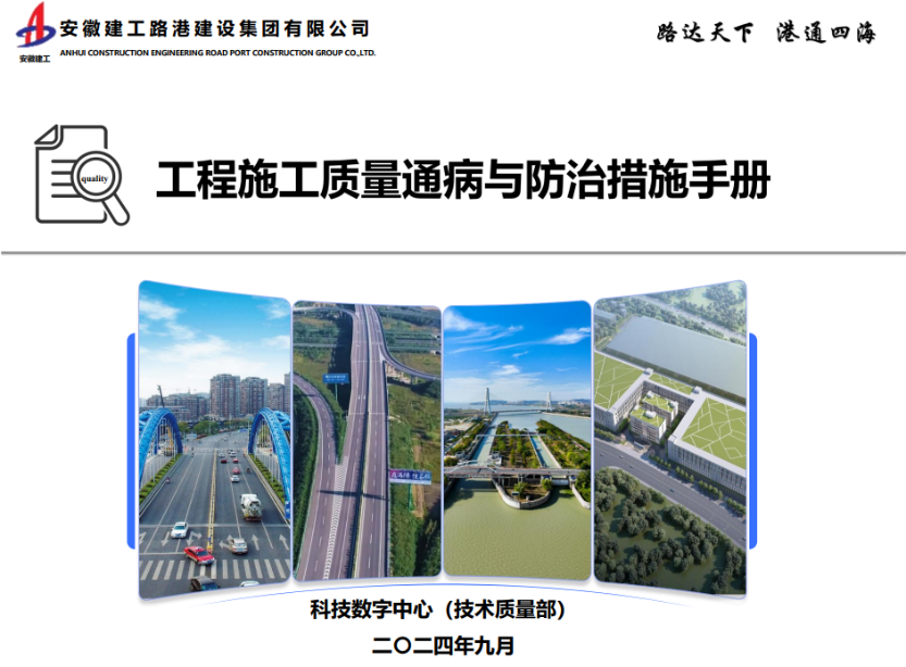 通病防治,推動(dòng)標(biāo)準(zhǔn)化建設(shè)。為落實(shí)集團(tuán)《關(guān)于加強(qiáng)集團(tuán)公司工程項(xiàng)目施工現(xiàn)場(chǎng)技術(shù)質(zhì)量管理的通知》文件精神,根據(jù)《2024年度質(zhì)量技術(shù)數(shù)字(建工路港科技(2024)4號(hào))的工作計(jì)化管理工作意見》的工作計(jì)劃,公司結(jié)合近年來(lái)項(xiàng)目管理經(jīng)驗(yàn)總結(jié),在《工程施工質(zhì)量通病與防治措施手冊(cè)》(2022版)的基礎(chǔ)上補(bǔ)充更新,并增加了隧道、水運(yùn)、房建施工內(nèi)容,手冊(cè)包括概述、常見質(zhì)量通病、具體實(shí)例與防治措施、質(zhì)量通病實(shí)用控制方法等章節(jié),為項(xiàng)目工程質(zhì)量通病防治提供參照依據(jù)。
