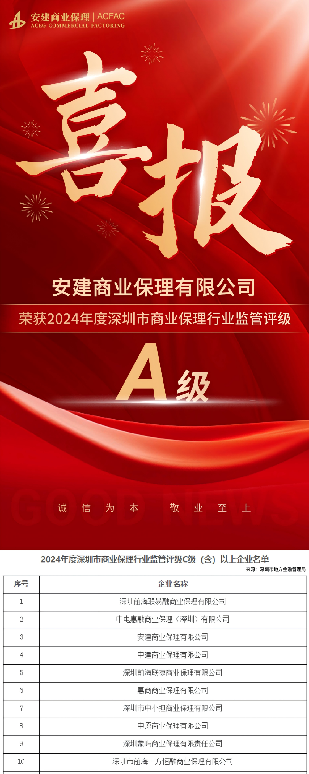 2024年11月4日,深圳市地方金融管理局正式發(fā)布了2024年度深圳市商業(yè)保理行業(yè)監(jiān)管評(píng)級(jí)C級(jí)(含)以上企業(yè)名單。安建保理以98.5分在此次370家參評(píng)商業(yè)保理公司中位列第三名,獲得最高評(píng)級(jí)A級(jí)。