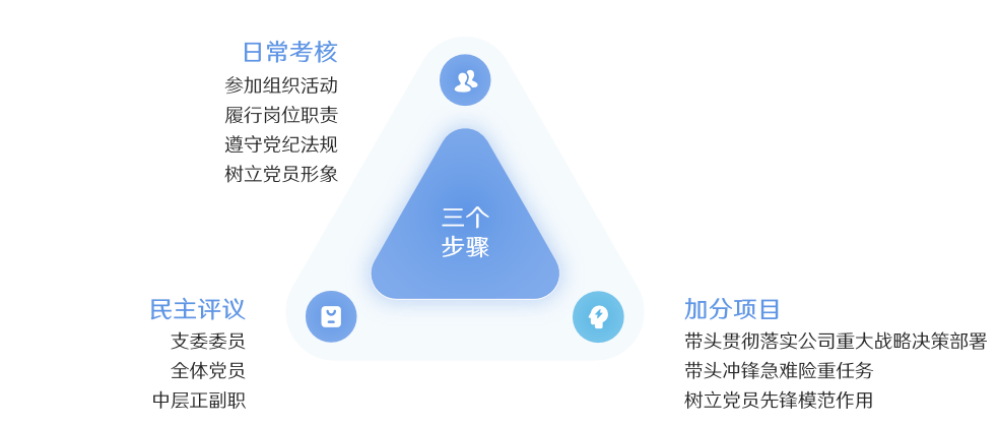 遵循“實事求是、立足崗位、獎優(yōu)罰劣、民主公開”的原則,設(shè)置日??己?、民主評議和加分項目三個部分,對黨員綜合表現(xiàn)進行客觀評價。其中,日??己司劢箙⒓咏M織活動、履行崗位職責、遵守黨紀法規(guī)、樹立黨員形象四個主要方面,設(shè)置扣分項目,對黨員履行基本義務(wù)提出明確要求。加分項目重在激勵黨員干部帶頭貫徹落實公司重大戰(zhàn)略決策部署、帶頭沖鋒急難險重任務(wù),樹立黨員先鋒模范作用。