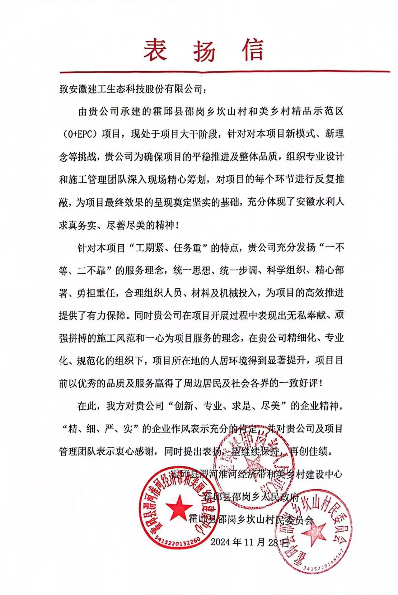 11月28日,安徽水利霍邱縣邵崗鄉(xiāng)坎山村和美鄉(xiāng)村精品示范村(O+EPC)項(xiàng)目獲霍邱縣邵崗鄉(xiāng)人民政府等多家單位來(lái)信表?yè)P(yáng)。