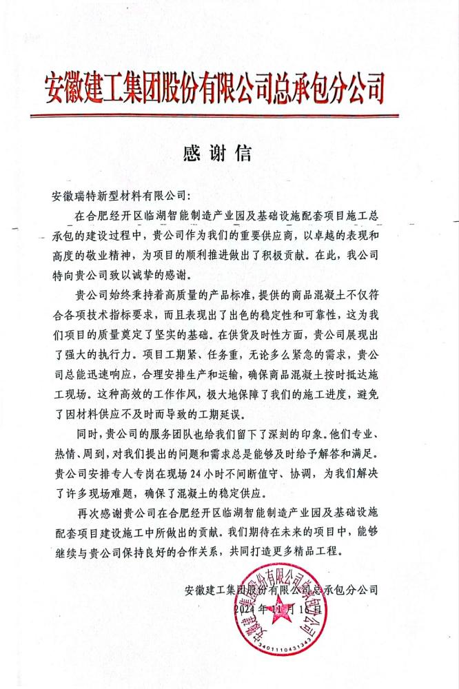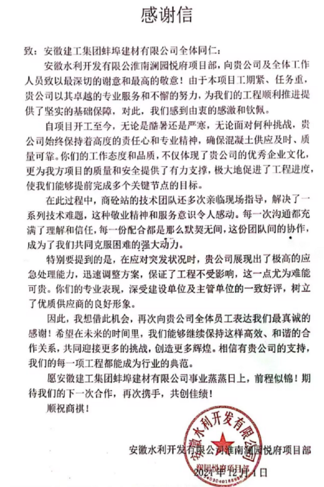 在信中,施工單位表達(dá)了對(duì)建工建材提供的優(yōu)質(zhì)混凝土產(chǎn)品的滿意和贊賞。他們提到,在項(xiàng)目施工過(guò)程中,建工建材的混凝土產(chǎn)品以其卓越的性能、穩(wěn)定的質(zhì)量和及時(shí)的供應(yīng),為工程的順利進(jìn)行提供了有力保障。這不僅大大提升了施工效率,還有效降低了施工成本,為項(xiàng)目的成功完成奠定了堅(jiān)實(shí)基礎(chǔ)。