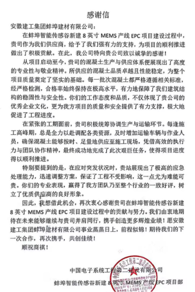 近期,建工建材憑借卓越的產(chǎn)品質(zhì)量、高效的供應(yīng)體系、出色的服務(wù)保障、精益求精的工作精神,收到了來(lái)自中國(guó)電子系統(tǒng)工程第二建設(shè)有限公司八寸線EPC項(xiàng)目、中鐵四局五岔片區(qū)城市項(xiàng)目、安徽水利淮南瀾園悅府項(xiàng)目、臨湖智能制造產(chǎn)業(yè)園項(xiàng)目的多封感謝信。