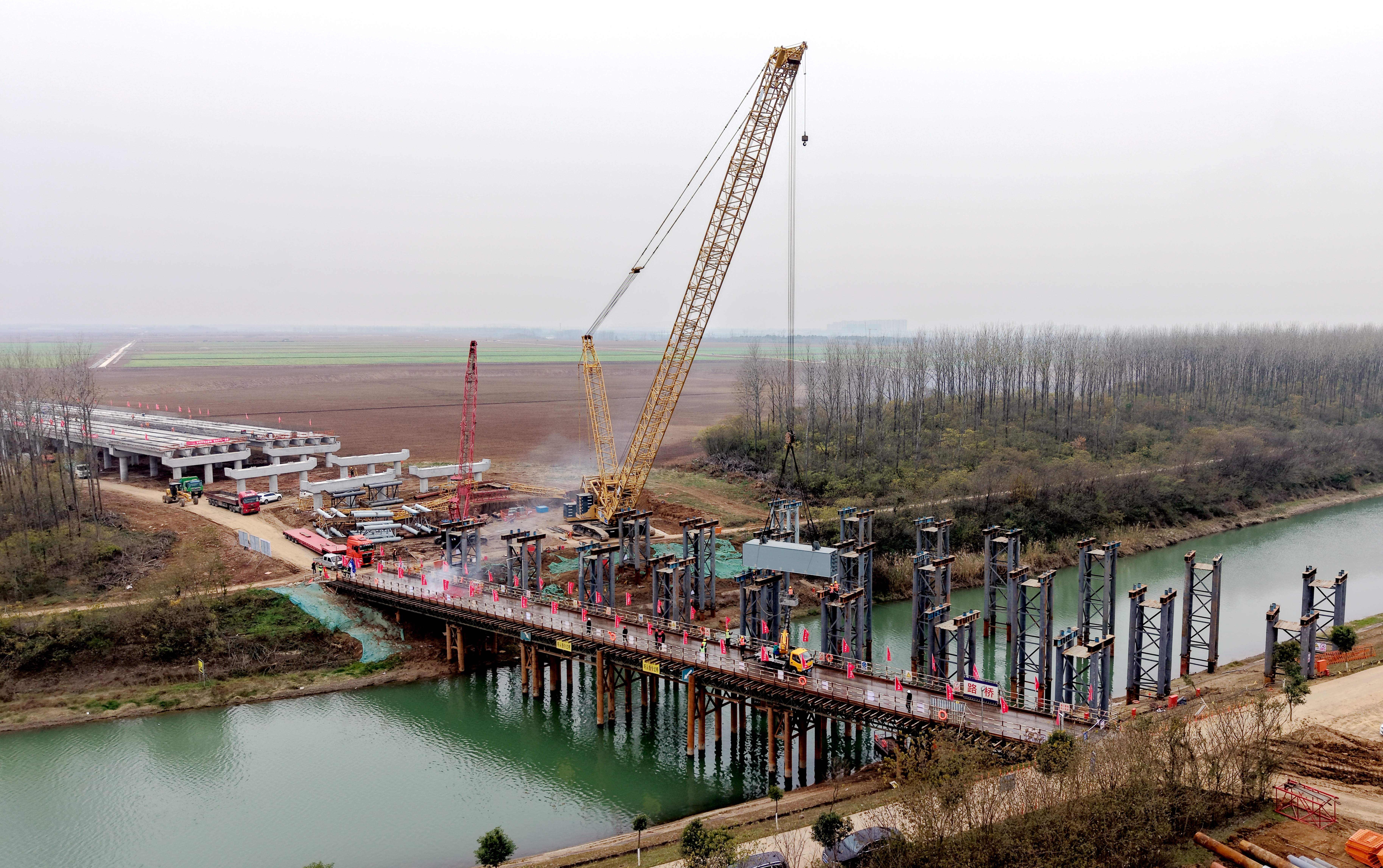12月10日上午,建工路橋淮桐高速合肥段路基2標淠河總干渠大橋主橋首片鋼梁順利完成架設(shè)。