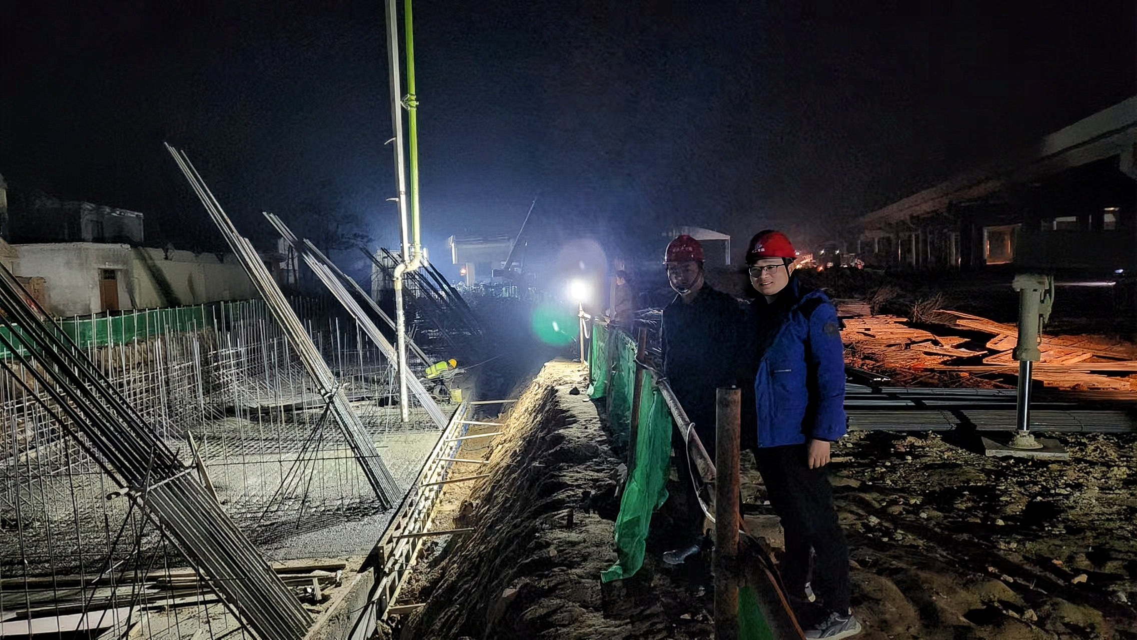 夜晚,星光照耀、接力前行。當(dāng)夜幕降臨,施工現(xiàn)場并未沉寂,混凝土輸送泵車、吊車等施工機械在轟鳴聲中運轉(zhuǎn),不同崗位的工人各司其職,全力推進(jìn)各項施工面的高效建設(shè)。